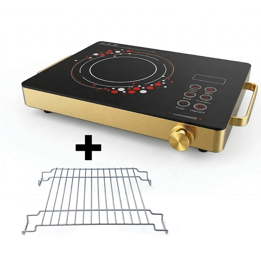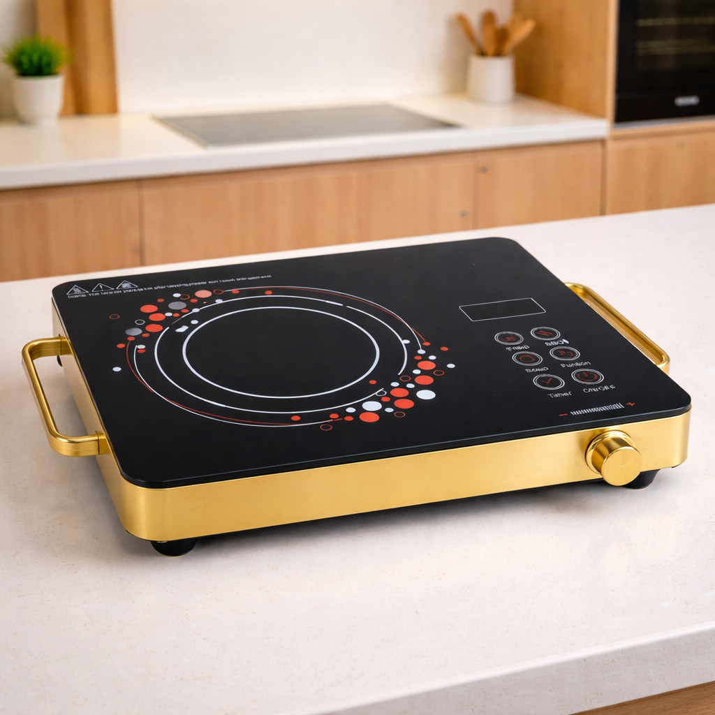 Elegant electric cooktop with luxurious gold-tone frame and black glass surface, featuring a radiant infrared heating element with 1800W power output.